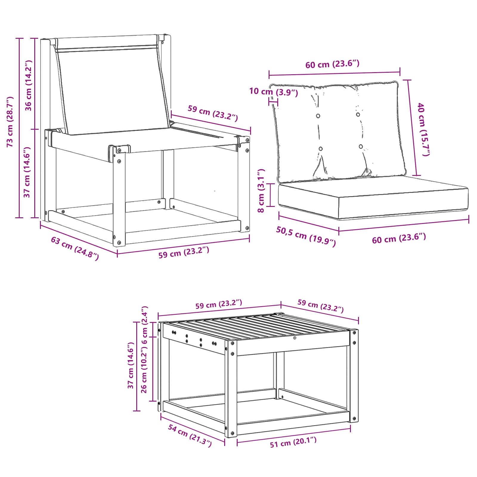 Sada zahradního nábytku spojuje styl a funkčnost, a je tak ideálním centrem pro každou zahradu nebo terasu. Její moderní design s čistými liniemi a minimem ozdob vnáší eleganci a přímo vybízí k venkovní relaxaci a setkávání s přáteli. Vyrobená jen z masivního akáciového dřeva, zaručuje dlouhou životnost a vizuální přitažlivost – skvělá volba pro ty, co hledají jak praktičnost, tak hezký vzhled.