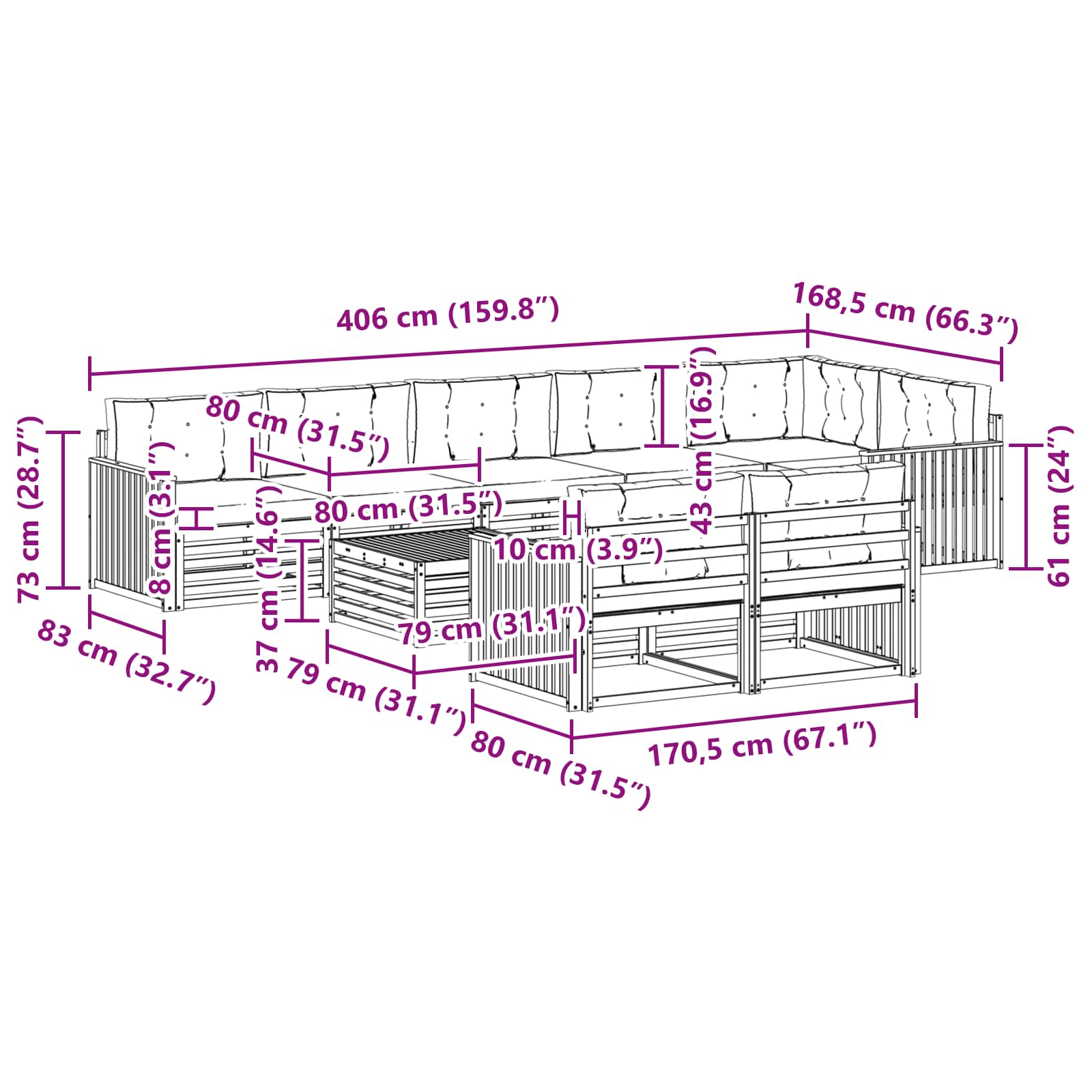 • 7 x Střední pohovka: 79 x 83 x 73 cm (DxŠxV)