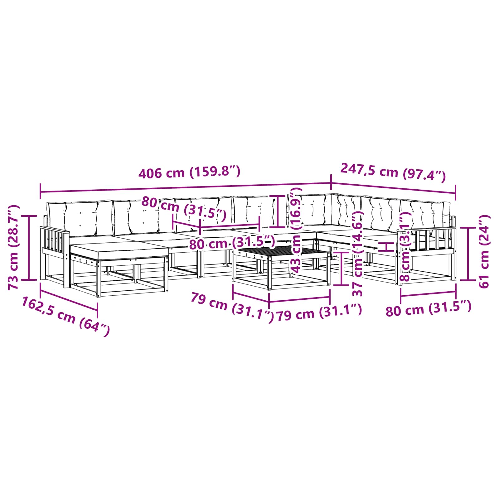 • 8 x Sedací polštář: 80 x 80 x 8 cm (D x Š x V)