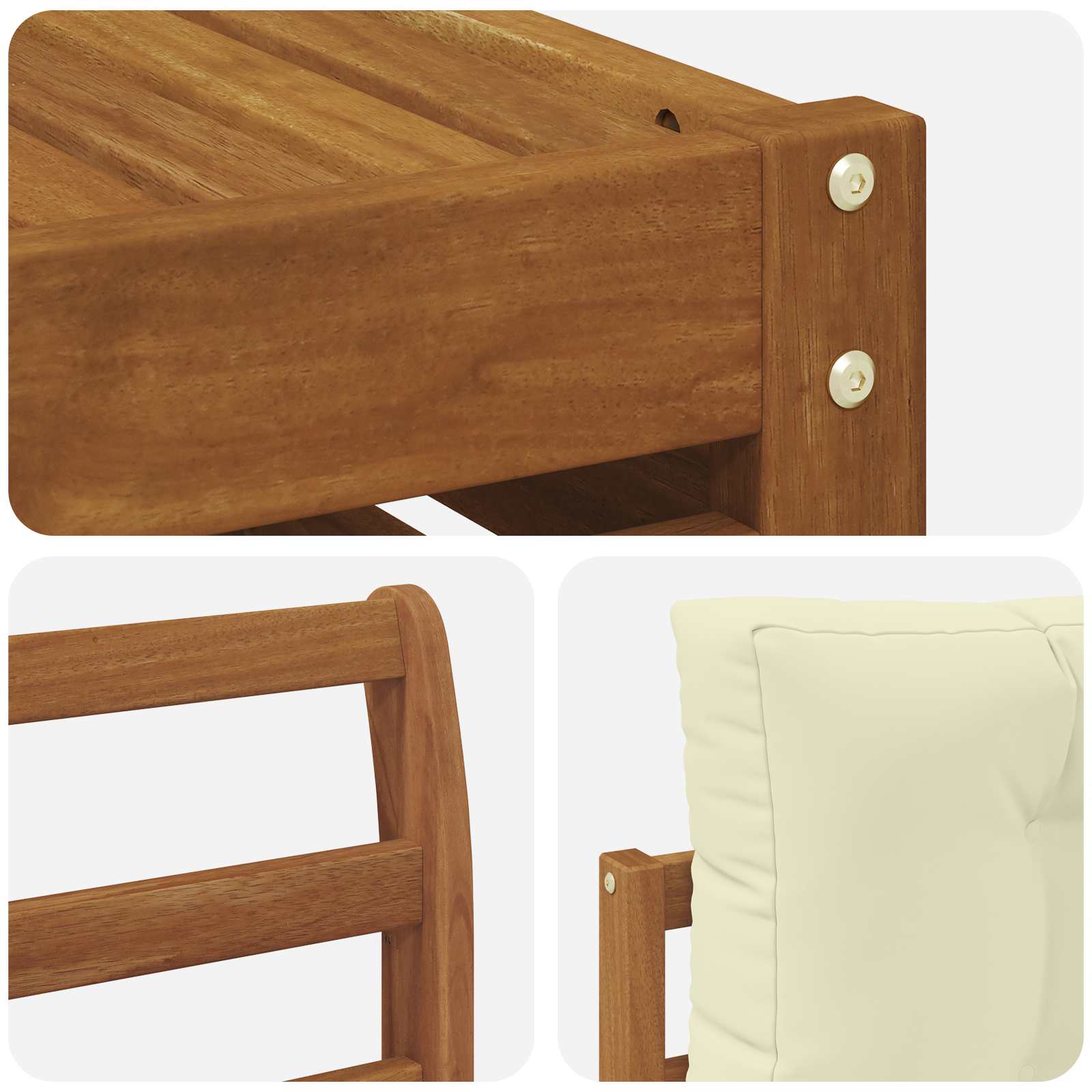 • Odolné masivní akáciové dřevo: Tato venkovní souprava je z masivního akáciového dřeva, které má pověst spolehlivého materiálu pro venkovní podmínky. Pevná konstrukce zajišťuje stabilitu a dlouhověkost, zatímco teplé přírodní tóny skvěle doplní jakoukoli zahradu nebo terasu.