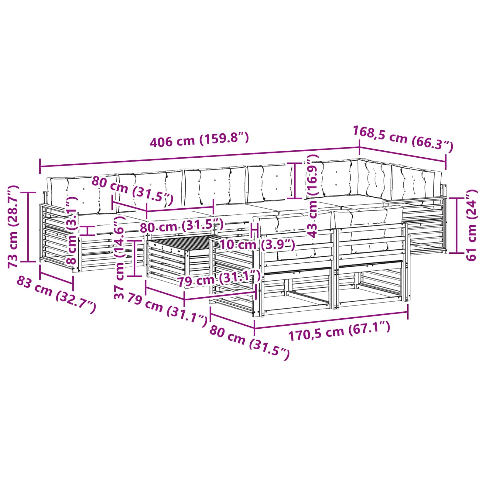 Tato venkovní souprava nábytku kombinuje styl a funkčnost a vytváří tak úžasný středobod na vaší zahradě nebo terase. Moderní design s čistými liniemi a jednoduchými detaily dodává eleganci a zároveň podporuje relaxaci i společenské akce venku. Celá je vyrobená z masivního akáciového dřeva, což zajišťuje trvanlivost a stálou vizuální krásu, ideální pro ty, kteří chtějí praktický a zároveň elegantní venkovní nábytek.