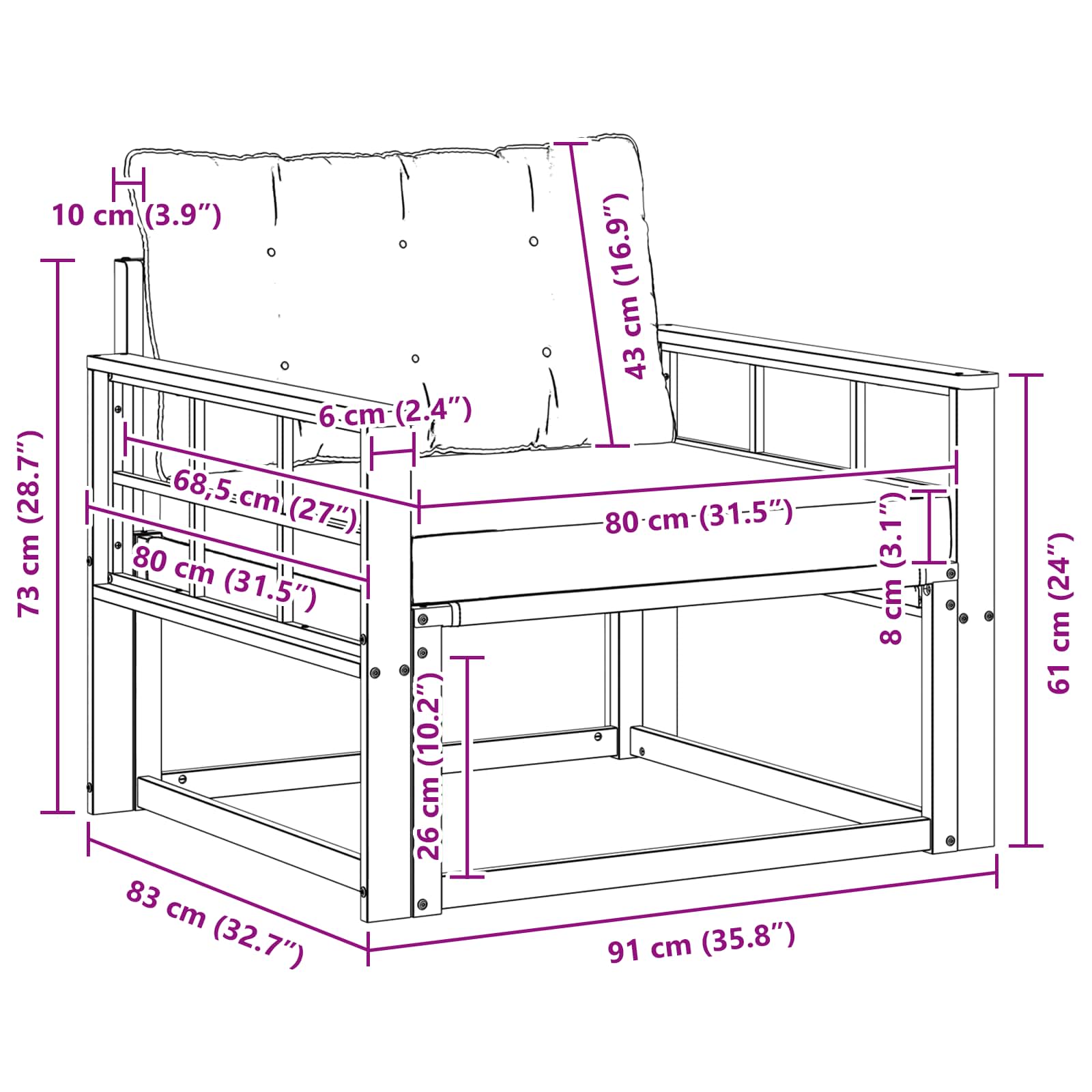 • 1 x Středový sofa: 79 x 83 x 73 cm (DxŠxV)