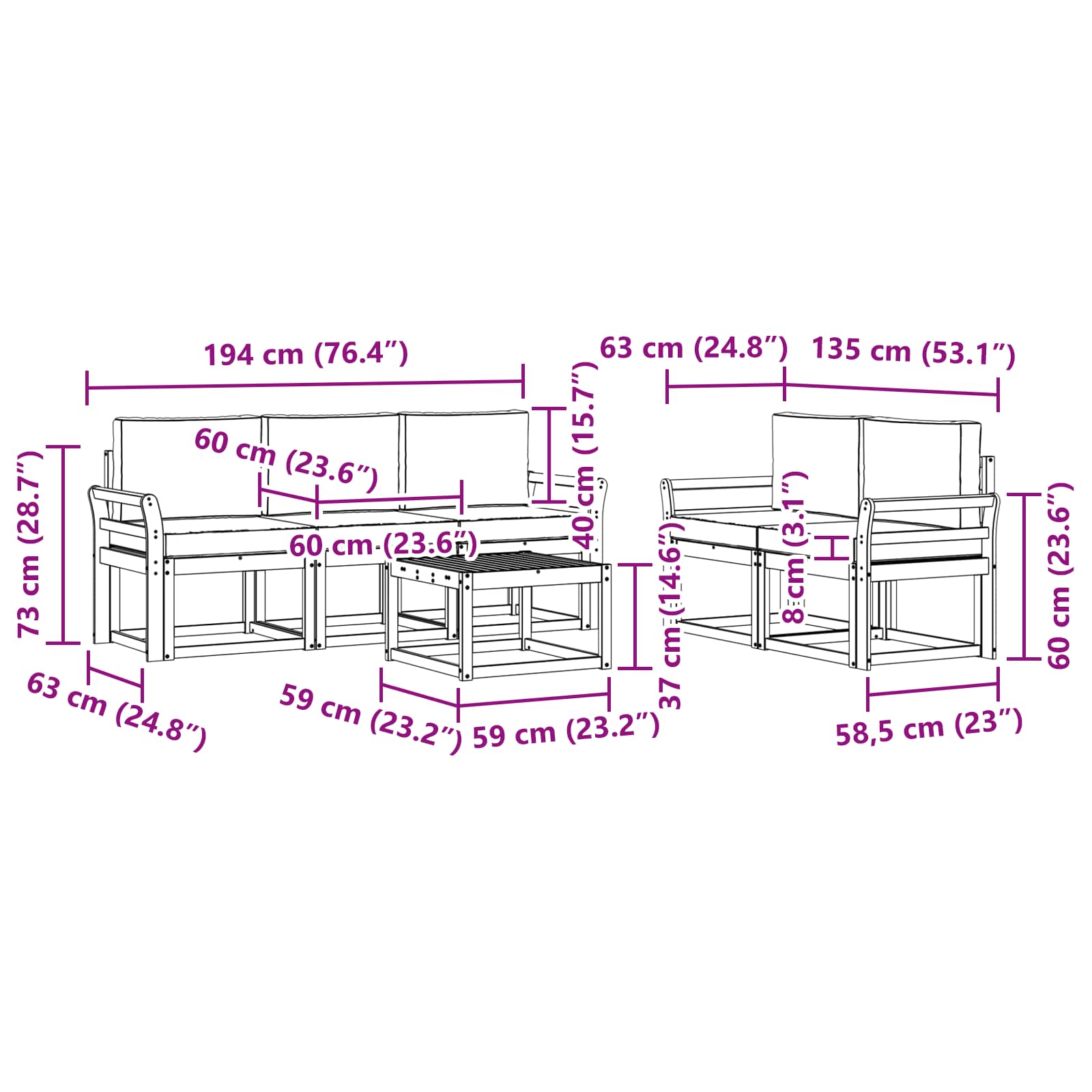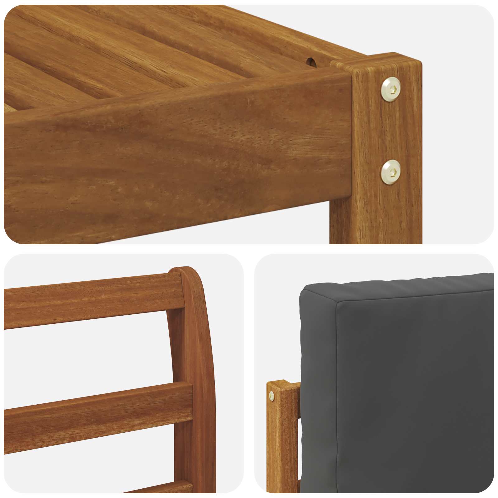 Tahle souprava venkovního nábytku spojuje styl s funkčností a skvěle se hodí jako ústřední bod pro vaši zahradu nebo terasu. Její moderní design s čistými liniemi vypadá elegantně a podněcuje k odpočinku venku a setkání s přáteli. Celá je vyrobená z masivního akáciového dřeva, což zaručuje odolnost a krásný vzhled, ideální pro ty, kdo hledají praktický a šik nábytek do exteriéru.