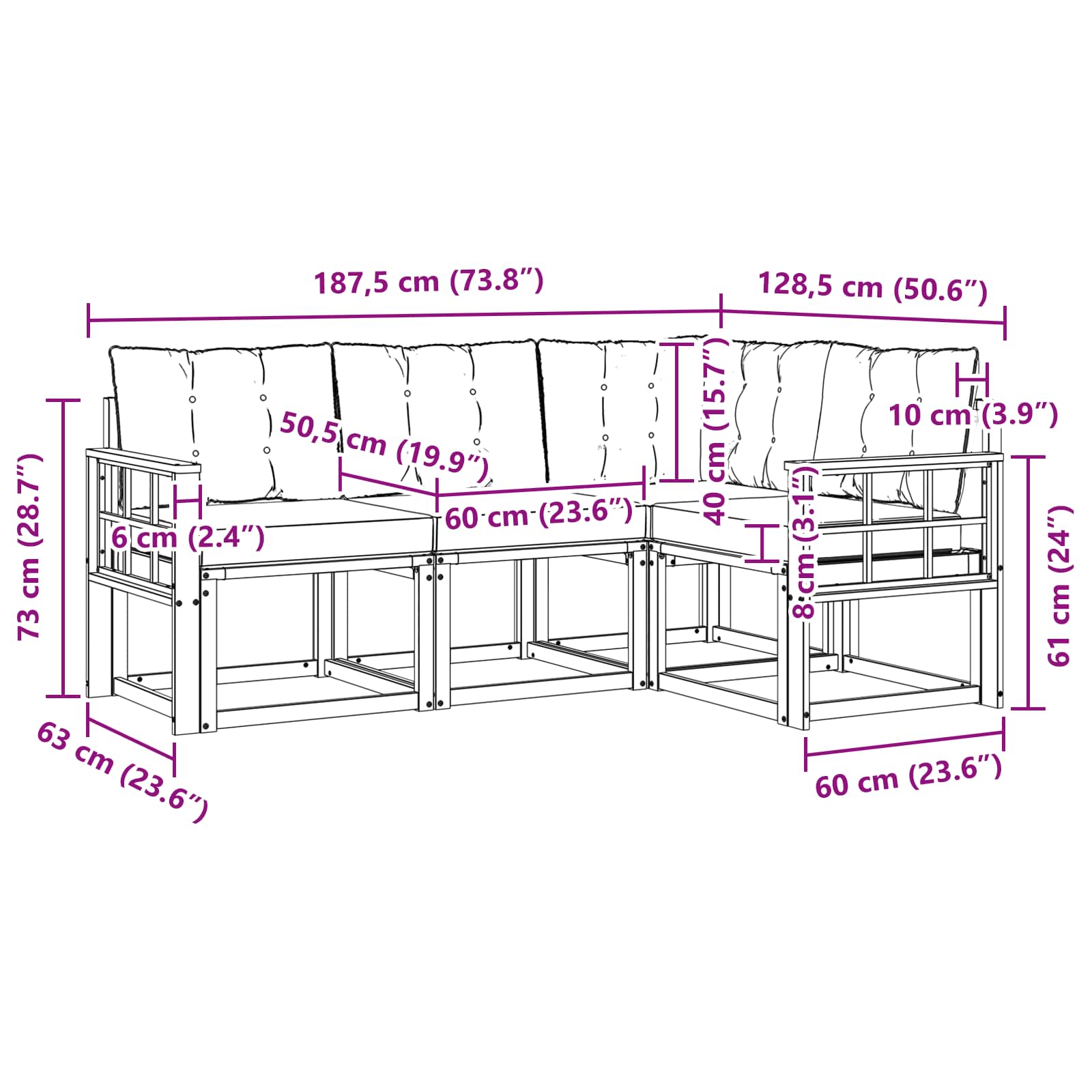 • 1 x Rohová sedačka: 63 x 63 x 73 cm (D x Š x V)