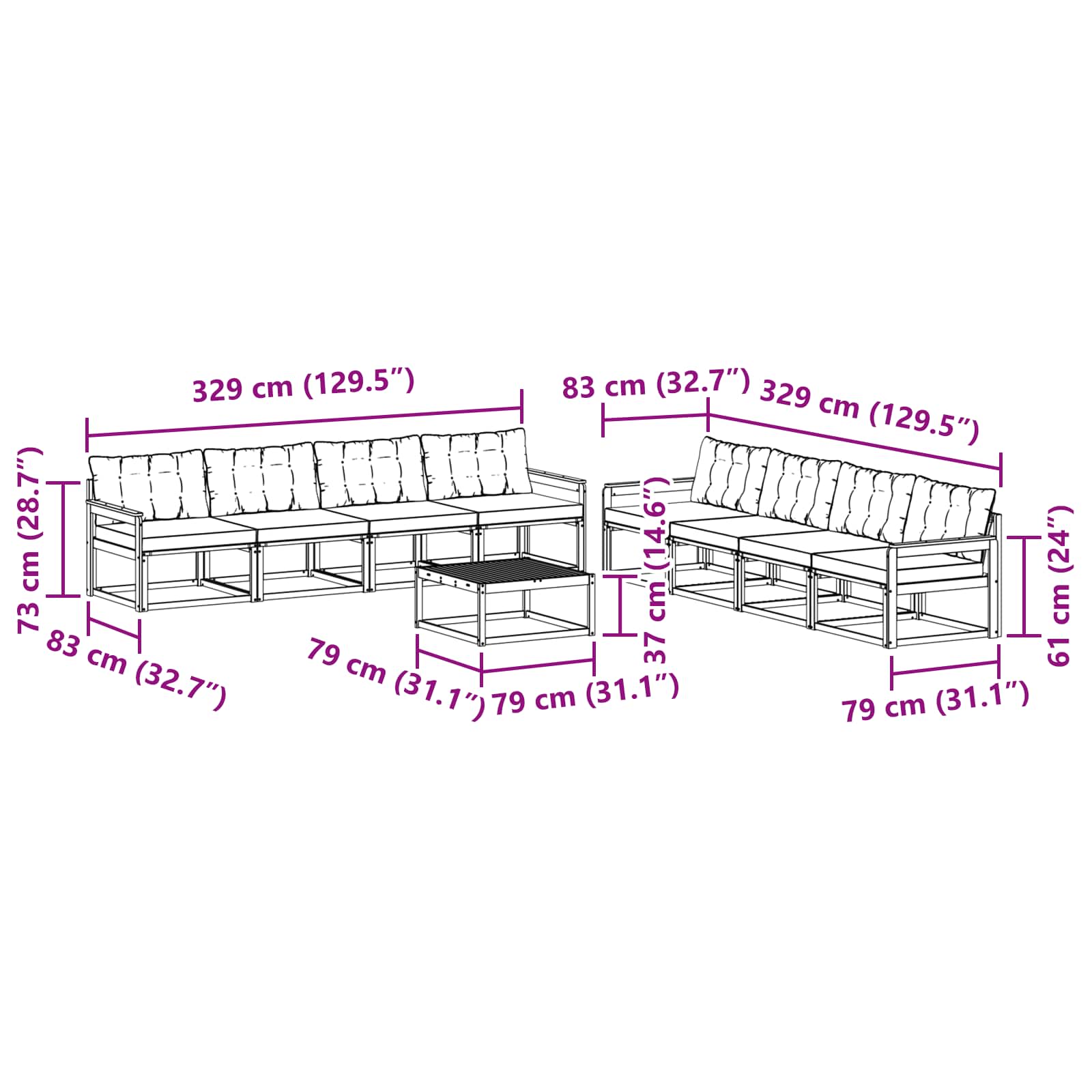 • 8 x Střední pohovka: 79 x 83 x 73 cm (D x Š x V)