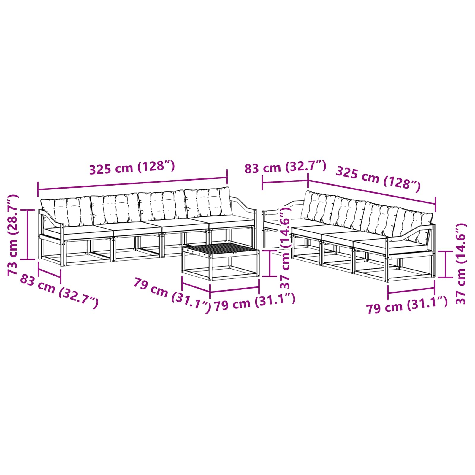 • 8 x Střední pohovka: 79 x 83 x 73 cm (D x Š x V)