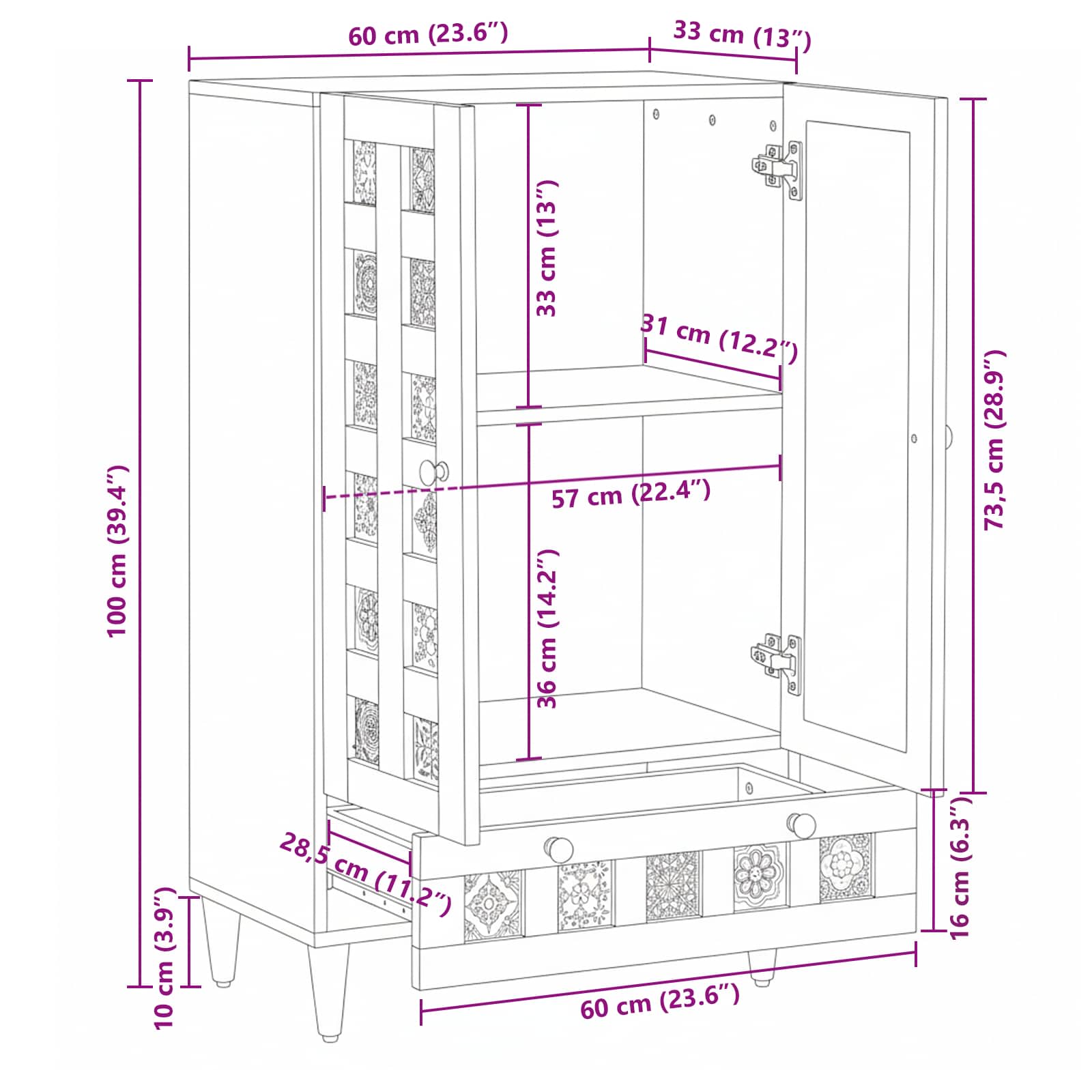 Tato moderní skříňka vypadá skvěle, f příjemně kombinuje styl, funkčnost a jednoduchost, což z ní dělá ideální doplněk do vašeho bytu či kanceláře. S elegantním obdélníkovým tvarem přináší minimalistickou atmosféru, co se hodí do spousty různých interiérů. Skříňka má spoustu úložného prostoru - zásuvky a dveře na pantech vám pomohou udržet věci pěkně uspořádané. Přírodní vzhled masivního mangového dřeva a MDF přidává místnosti teplo a charakter.