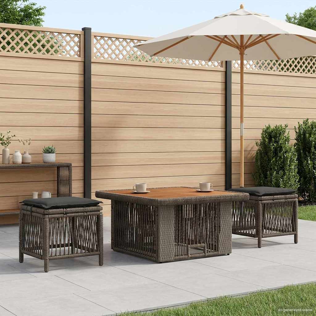 Tato zahradní jídelní souprava je stylový a univerzální doplněk do jakéhokoli venkovního prostoru. Kombinuje krásu poly ratanu a akáciového dřeva s odolnými, povětrnostně a UV zářením odolnými materiály. Obsahuje výškově nastavitelné stoly, pohodlné židle s odnímatelnými polštáři a nastavitelnými nožkami pro stabilitu, takže se snadno přizpůsobí různým potřebám.