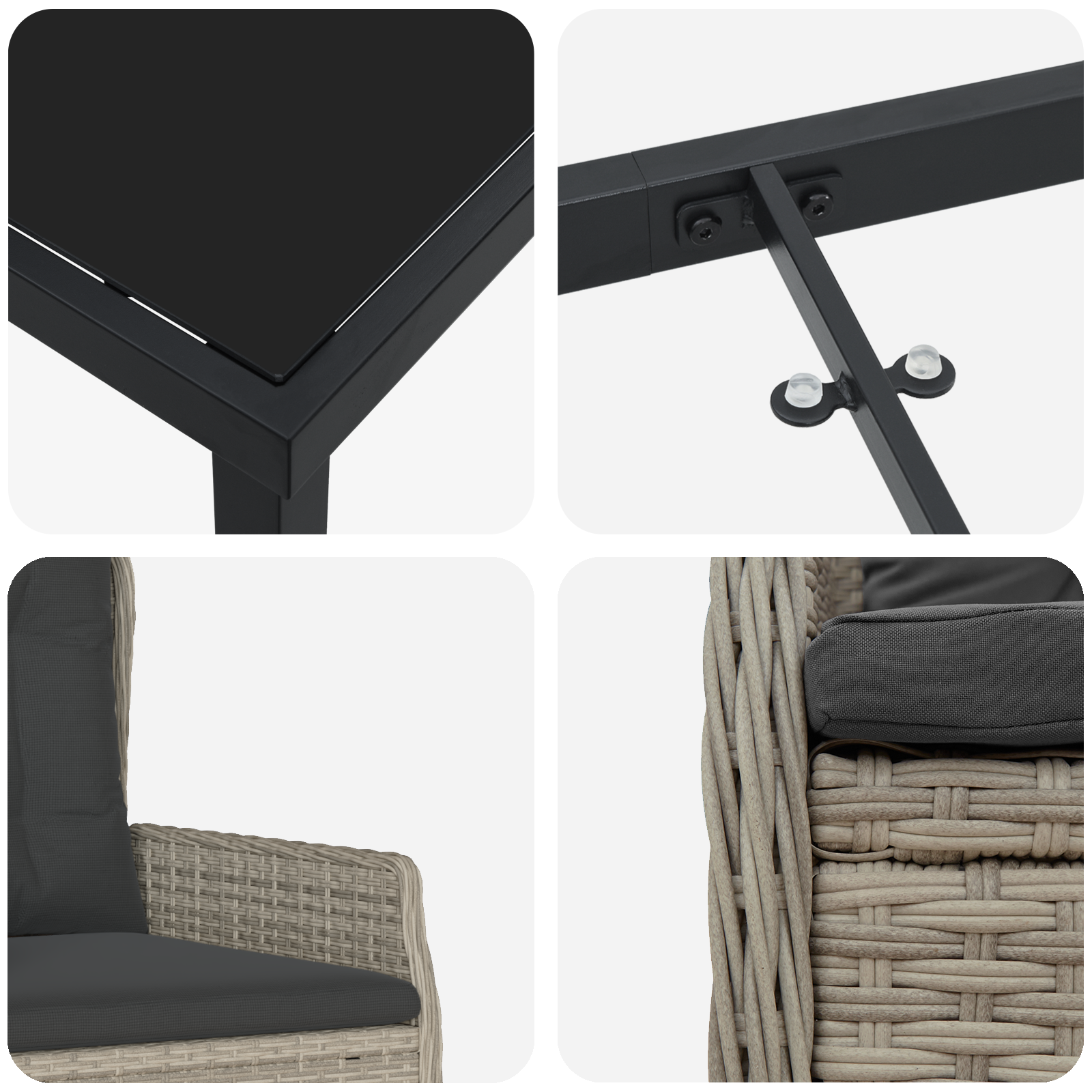 Tento moderní zahradní jídelní set je perfektní mix stylu a funkčnosti pro jakýkoli venkovní prostor. Zdůrazňuje čisté linie a elegantní prvky. Jeho moderní design vám skvěle doplní zahradu nebo terasu, ideální pro rodinná setkání nebo intimní večeře venku. Hlavní materiál, poly ratan, má hladkou texturu, díky které se krásně hodí do každého prostředí, a zároveň poskytuje spolehlivé pohodlí. Vylepšete si tak venkovní jídelní zážitek kombinací moderní estetiky a praktičnosti.