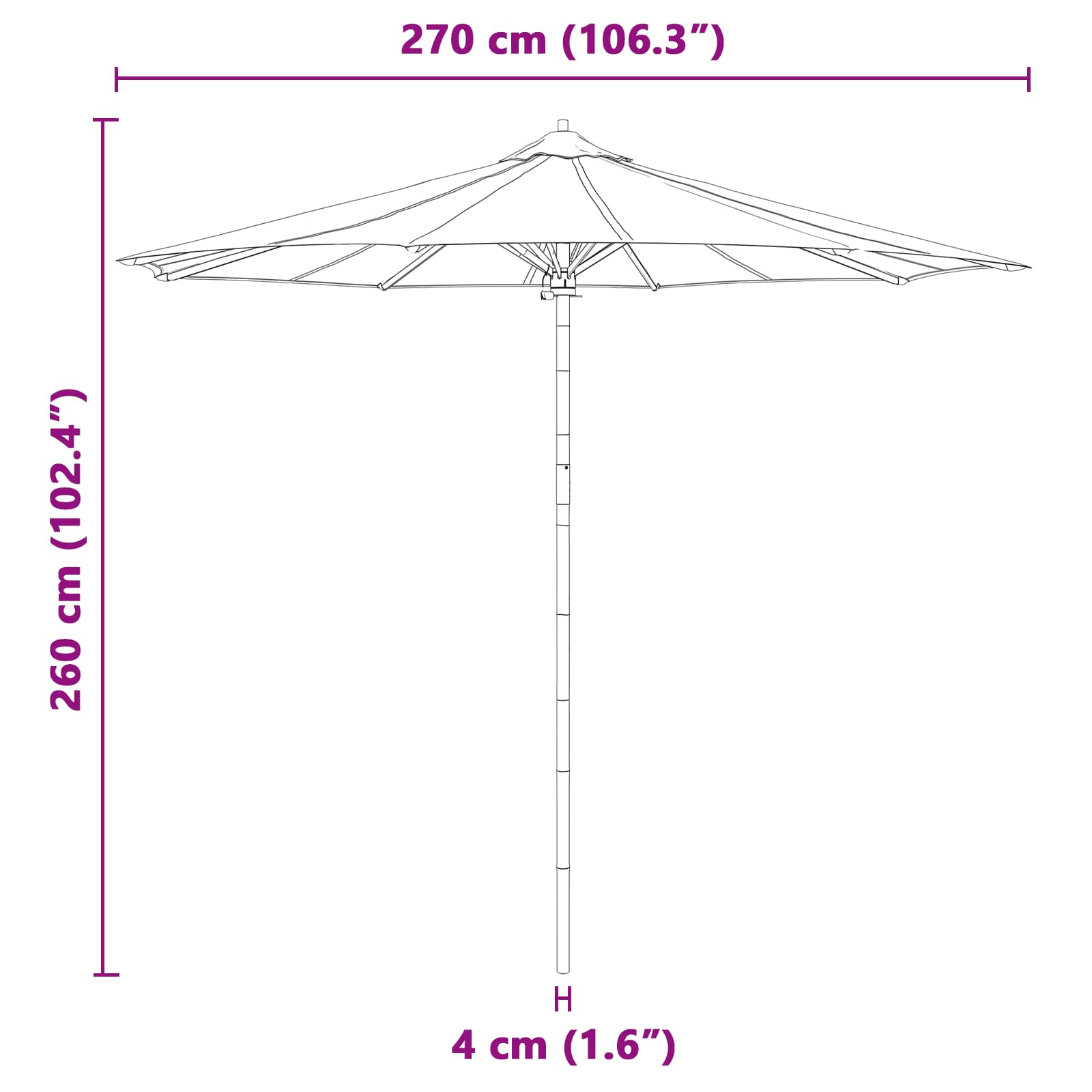 • Odolný rám z bambusu Rám slunečníku z bambusu je pevný a lehký, takže ho snadno přemístíš, a ještě to vypadá skvěle. Bambus dodává přírodní a rustikální vzhled a zaručuje dlouhou životnost i při všelijakém počasí, takže se nemusíš bát větru ani sluníčka.